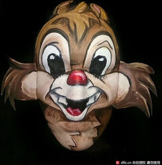 她笑說,每個造型都要花費好幾個小時才能完工,首先戴上禿帽,接著以親膚的人體彩繪顏料開始繪製,至少要花3到4個小時。她表示,所有造型中,最喜歡唐老鴨,從小就喜歡迪士尼的動畫,最愛的動畫人物就是它。