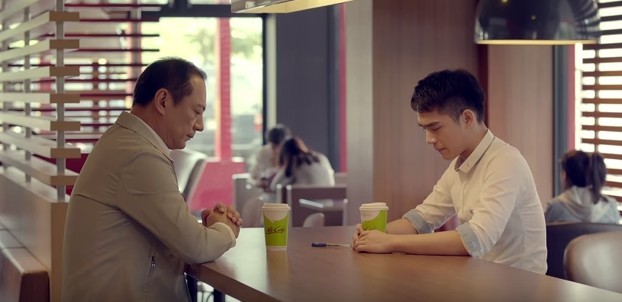 影片中,一對父子默默不語坐在麥當勞,兒子前方擺著一杯咖啡杯,上面以原子筆寫下「我喜歡男生」,爸爸大嘆一口氣後離席,留下失落傷心的兒子呆坐在原位。