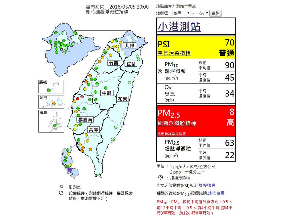 ▲環保署空氣監測網站顯示,測得5日高雄小港,細懸浮微粒(PM2.5)達到紅色警戒。(圖/翻攝自環保署空氣監測網站)