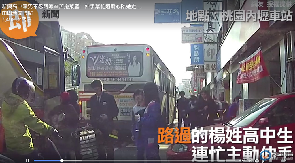 有民眾2日下午在桃園市內壢的中華路目擊一位老婦人拿著推車站在公車門口,苦惱該怎麼把推車拿上車時,一名新興高中的學生見狀上前幫忙,讓目擊的民眾感到相當溫暖,上網PO文讚賞這名同學,這位同學楊承諭表示,只是希望社會可以多一點溫暖,這樣大家才可以更幸福。