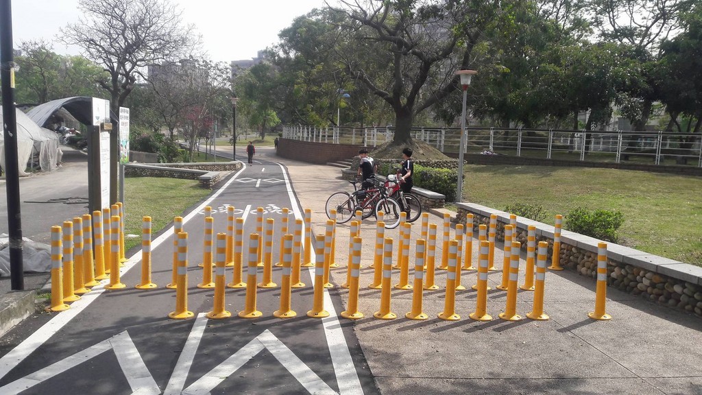 ▲桃園市南崁溪自行車道出現55根防撞軟桿,網友看到後怒罵:障礙挑戰賽嗎?(圖/翻攝自爆料公社)