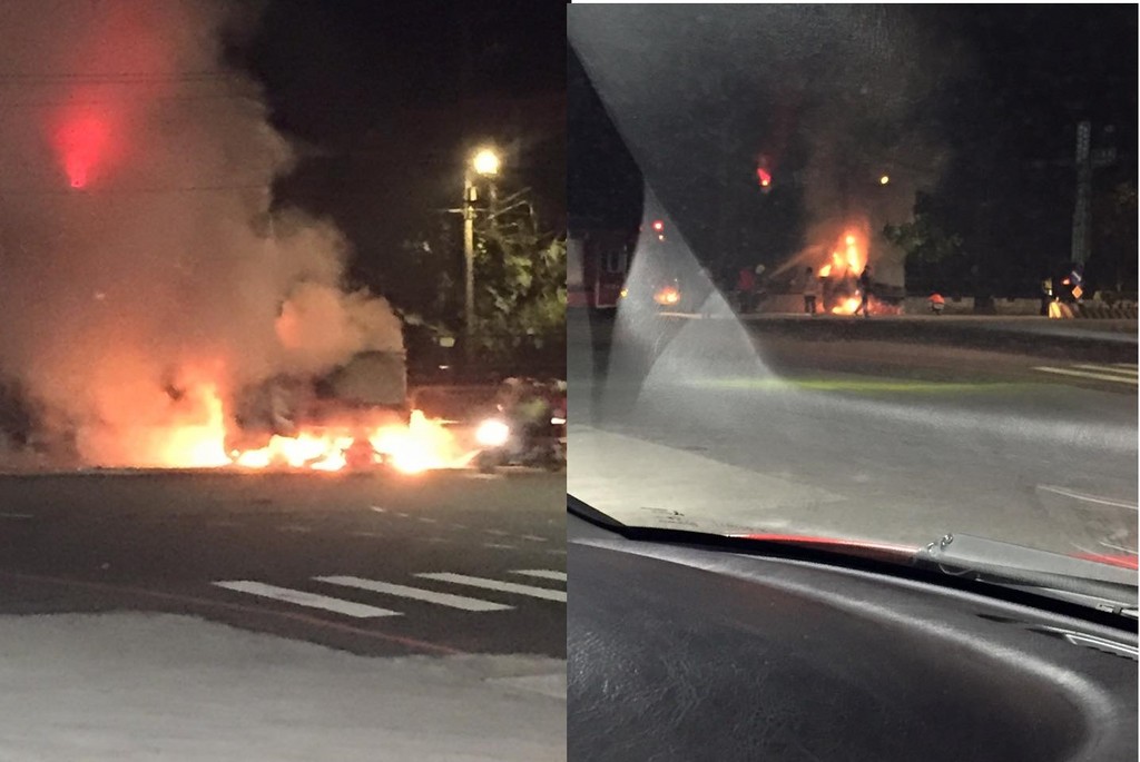▲六堵加油站附近疑似貨車超車不慎,撞到路燈起火燃燒。(圖/翻攝自爆料公社)地方中心/基隆報導基隆市六堵加油站附近6日晚間傳出火燒車意外,一台貨車疑似超車不慎,撞到路燈,「碰」一聲燒起來了,目前車內的民眾還沒出來。