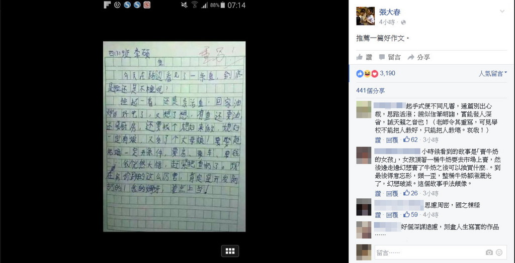 「今天在路邊看見了一條魚,到底是撿還是不撿呢?」知名作家張大春7日在臉書上,分享一篇署名小四學生「李碩」,以《魚》為題撰寫的文章,並大讚是一篇「好作文」。