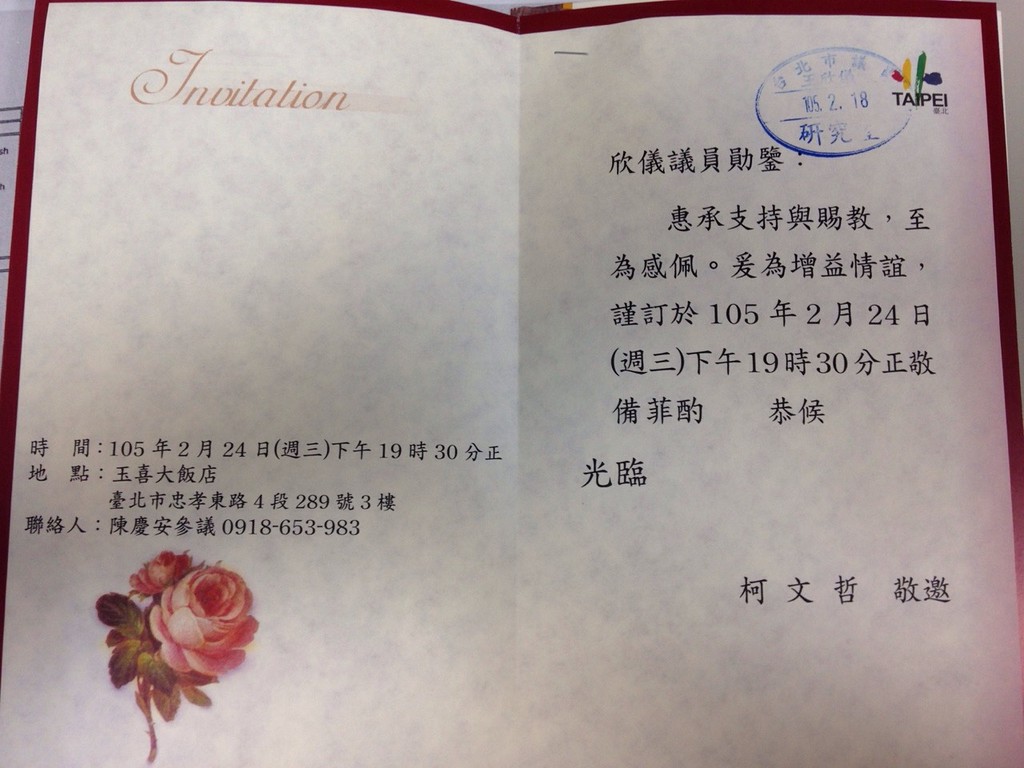 ▲ 柯文哲宴請國民黨議員邀請函曝光。(圖/議員提供)