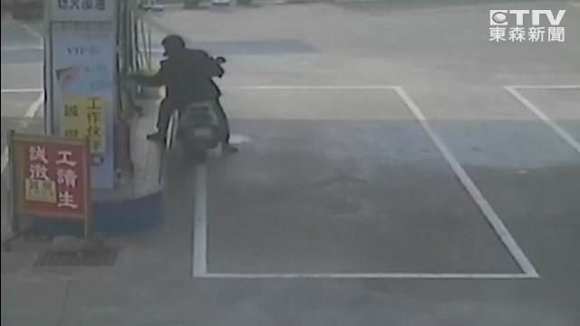台中市有一名60歲的無業林姓男子騎車到加油站,趁員工不注意,快速打開收銀台的鐵櫃,偷走裝現金一千多元的包包後逃逸,紅燈右轉時遭到警察攔截,還衝撞警察,逃了5公里後,在路邊自摔,滿臉是血,也造成一名警員在圍捕過程中,還不慎摔車,所幸沒有大礙。