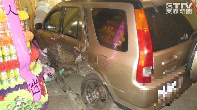 ▲轎車被撞進靈堂,影片最後一秒驚見「人臉」。(圖/東森新聞/下同)