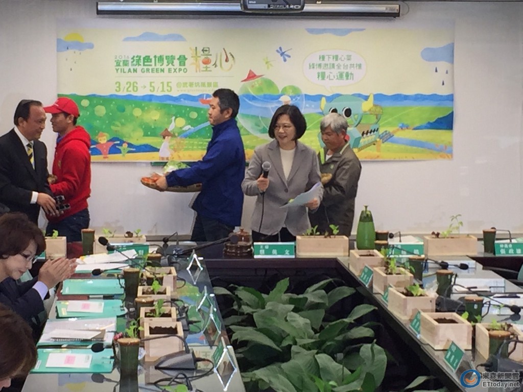 ▲民進黨總統當選人蔡英文9日下午與宜蘭縣長林聰賢、全體中常委在中常會前宣傳「2016綠色博覽會」。(圖/記者陶本和攝)