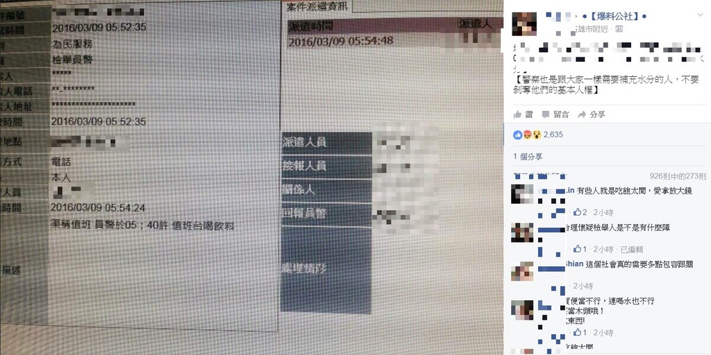 警察需要接受各式報案,但這樣的投訴合理嗎?網友的文章中提到,看到一則民眾凌晨5點多的檢舉,原因竟只是「看到員警在值班台喝飲料」,「又有沒有同理心的民眾檢舉警察補充水分!不要剝奪他們的基本人權。」網友們一面倒的狂罵,「合理懷疑檢舉人是不是有什麼障礙?」「是上廁所也不可以?」「檢舉魔人!乾脆檢舉警察呼吸好了。」