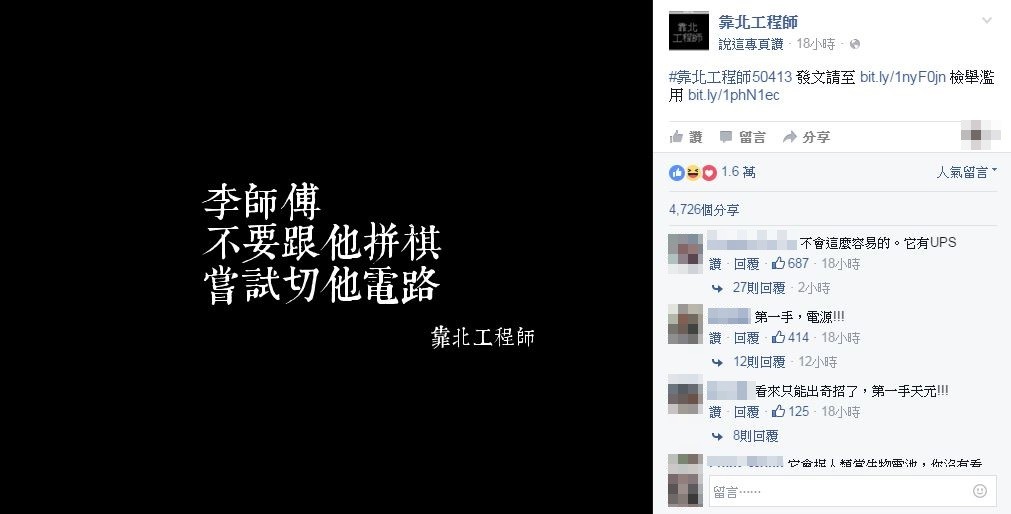 Google DeepMind圍棋挑戰賽中,AlphaGo再次擊敗過去10年中最佳棋手李世乭,雙方比賽時間超過4小時,總共下了211手。對此,臉書專頁「靠北工程師」提出KUSO建議,「李師傅,不要跟他拼棋,嘗試切他電路。」這簡直讓網友笑翻,不到1天時間就吸引1.6萬人按讚、超過4千則分享。