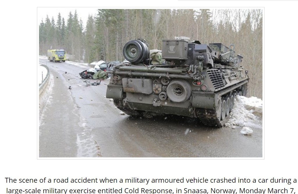 北約13國特別出動1萬5千名士兵3日在挪威進行2016年「寒冷回應(Cold Respons )」大型聯合訓練作戰,7日卻傳出挪威一輛軍用裝甲車撞毀、輾爛一台小轎車,造成轎車駕駛當場死亡的不幸消息。