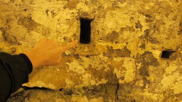 這些小洞的實際用途還有待考證,有一說是當初建築施工時,為了砌築上方拱形屋頂,而鋪設鷹架時所遺留的孔洞;另有一說是,牆璧上一個個凹洞是國軍駐防期間因地面潮濕,用來架木板做成隔層及懸掛吊床之用。