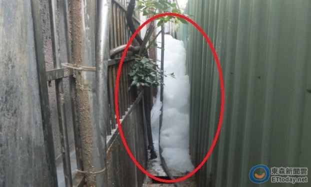 ▲工廠後方溝渠中堆積1公尺高白色泡沫。(圖/新北市政府環境保護局提供,下同)