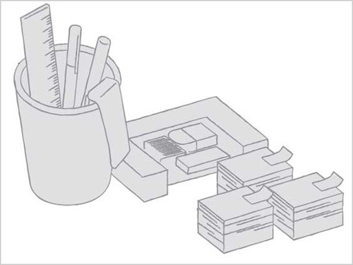 在桌面工作區的規畫上,張立德將電腦螢幕靠左擺放,螢幕旁邊放筆筒,左邊隔板釘著常用的廠商聯絡電話、辦公室分機表、工作用文件,打電話時就能一目了然;個人旅遊或家人照片,則貼在另一邊的隔板。辦公用品中,文具雖然使用頻率一樣,但因為形狀、體積大小不一,為了在使用工具時更有效率,張立德建議將長條形的尺、筆和平板狀的橡皮擦、訂書機、訂書針分開收納,以免放在筆筒底部的橡皮擦或訂書針取用不易。