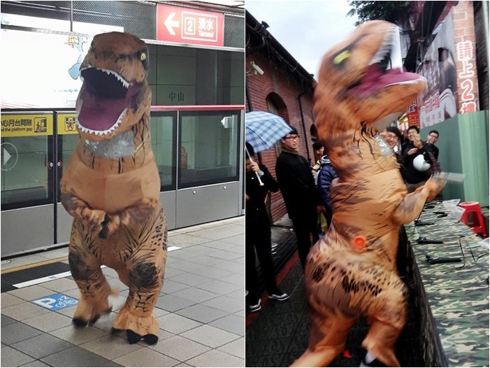 恐龍好忙!有網友11日陸續在捷運上捕獲一名穿著「大嘴龍」造型的民眾,一路搭車到中山站,還在月台走來走去,模樣搞笑,下一站還跑到士林夜市,被目擊在巷子裡嗨玩射氣球遊戲,短短的雙手幾乎沒辦法握槍,露出手部,底下還穿著黑色NIKE球鞋,一旁圍觀群眾都被逗得哈哈大笑,拿起手機猛拍。
