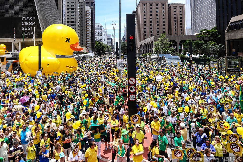 巴西13日開始約有300萬人在各大城市走上街頭示威,抗議總統羅塞夫(Dilma Rousseff)執政無能與黨員捲入貪腐弊案,並要求下台。最大城聖保羅大約有140萬抗議群眾,穿著象徵巴西色彩的黃色與綠色衣服,高喊「羅塞夫下台」。現場還有一隻被抗議者抬出的黃色小鴨,以諧音表示對於經濟不滿。