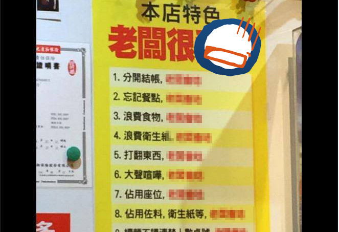 有網友在臉書社團「爆料公社」分享一張照片,地點是在某間餐廳店內,牆上張貼著大張海報,清楚寫著本店的特色是「老闆很愛唸」。上頭明列10項會招惹老闆生氣的原因,包括「分開結帳、忘記點餐、續麵不講清楚人數桌號」等,讓網友看了不禁稱讚「好霸氣」、「比我阿嬤還會唸」。