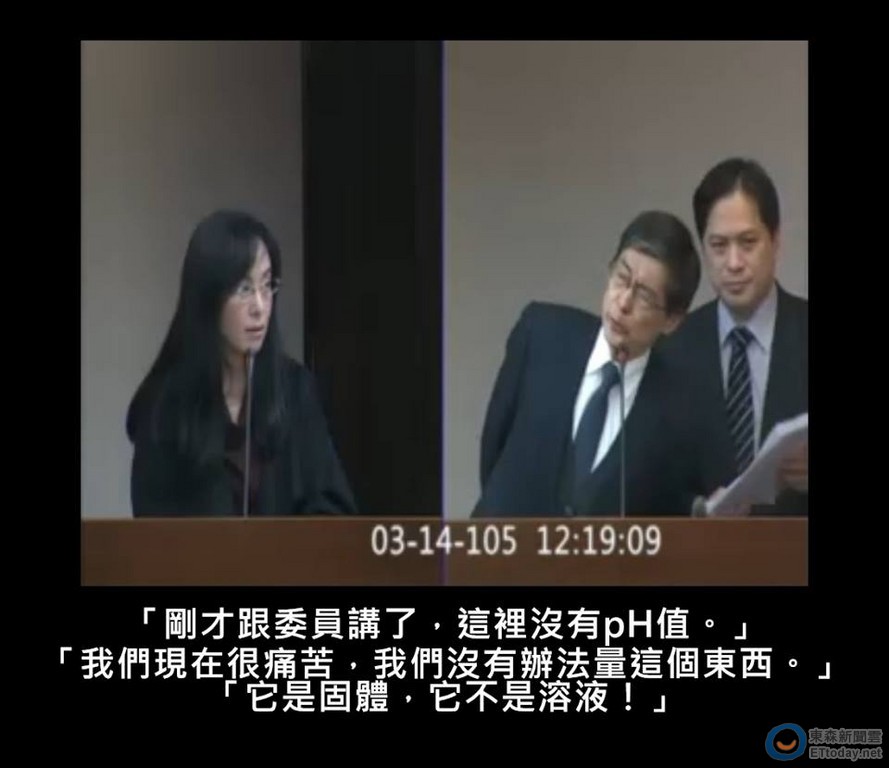 但陳瑩又不死心,再問吳明機一般各式爐碴的pH值大概多少?讓一旁的的魏國彥看不下去,跳出來回答,「剛才跟委員講了,這裡沒有pH值」,因為它是固體怎麼量pH值呢?「我們現在很痛苦,我們沒有辦法量這個東西,那你要我們回答一個pH值?」
