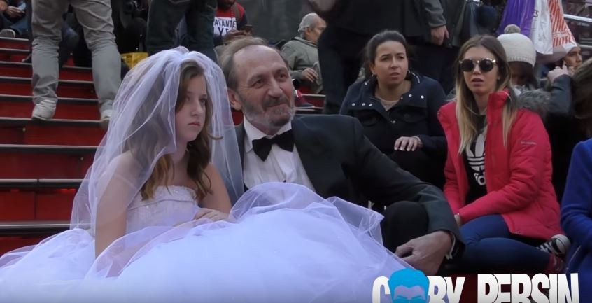 網路紅人布里森(Coby Persin)日前在YouTube頻道上傳一部影片,畫面中,人來人往的街頭正在舉辦一場婚禮,引人注目的是,新郎和新娘的年紀竟然相差超過50歲。只見一名65歲頭髮稀疏的老伯,帶著滿臉笑容,主動牽起一名12歲少女的手,兩人曬恩愛拍婚紗,路人紛紛露出不可思議的表情,甚至上前阻撓斥責。
