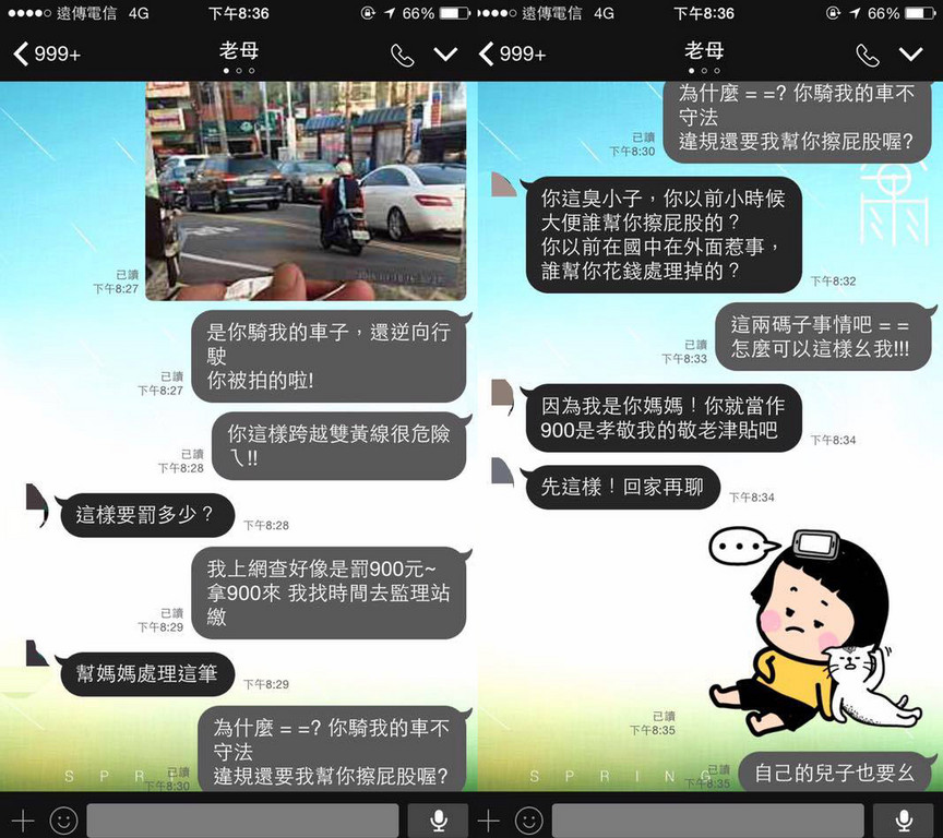 一位蔡姓網友上傳與媽媽的LINE對話,笑倒不少網友,這位媽媽騎著兒子的機車違規被拍,還告誡他不要亂違規,兒子無奈解釋自己都是開車,很久沒騎機車,而且定睛一看,照片上的違規騎士,明明就是媽媽自己,蔡男無奈戳破,沒想到媽媽硬ㄠ要他出錢,還說「你這臭小子,你以前小時候大便是誰幫你擦!」這個理由讓他反駁不得,只好乖乖繳錢。