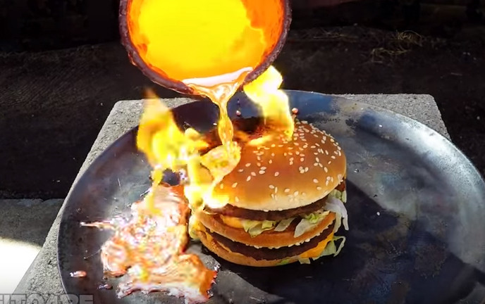 Youtube頻道經營者Tito4re實驗以1085度C的銅汁,淋在大麥克上,沒想到銅汁淋上去,麵包只有被烤黑,不像其他物品一樣快速液態化,接著他手動將麵包拿開,繼續將銅汁淋在肉片上面,但沒想到火都燒起來了,漢堡一樣沒事,接著他將所有分層夾開,可以看到生菜、起司跟第二層肉都被攤開擺在鐵板上。