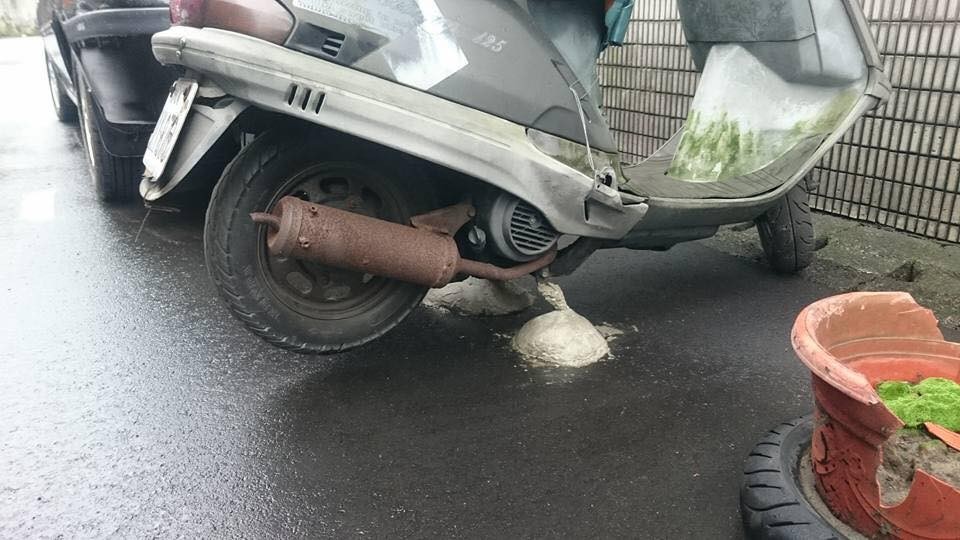 ▲機車中柱被灌上「水泥」固定,網友狂酸「報廢機車變路霸!」(圖/翻攝自臉書爆料公社,網友鎰銘哥提供)