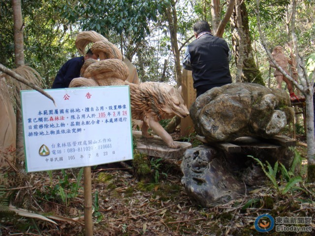 台東林管處表示,南橫公路旁2月間遭人設置九尾狐、怪異人像等雕像及宗教器物於6處,讓當地居民看得發毛,許多野生動物也都被嚇跑,便趕緊通知相關單位處理。經公路總局及林管處現場勘查後,確認其中2處為國有林班地,隨即插牌公告,限期1個月內(3月24日前)主動移除,否則鄉依法逕行排除。