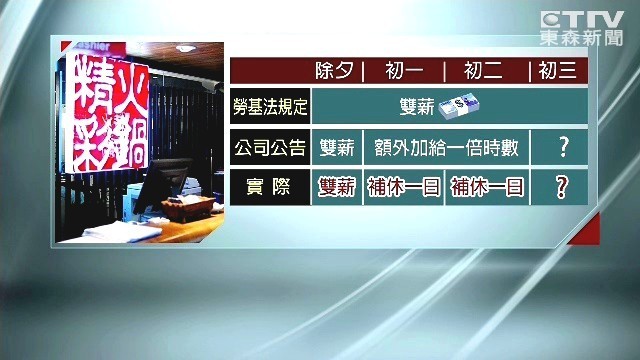 投訴員工指出,「以往的話就是沒有補假這種東西,薪資都是會正常的雙倍,雙倍薪水這樣子,這次沒有,這次他們過年前說,只有補假而已然後不發雙薪。」