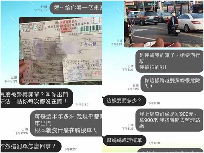 蔡姓網友最近在臉書社團「爆廢公社」PO文,分享一段與媽媽的對話。他先是傳訊息跟媽媽說「給你看一個東西」,接著傳出自己名下機車被開一張違規罰單的照片,媽媽馬上開始教訓他,「怎麼被警察開單?」要兒子出門要守法一點;兒子趕緊喊冤,半年多幾乎沒在騎車都是開車,接著就把被拍到的舉發照公開。