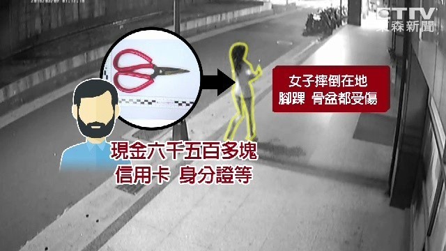 李女7日深夜獨自走在天祥路上,侯男突然從後方拿剪刀威脅她,並搶走包包,內有現金6500多元、信用卡和證件等,騎車逃逸,畫面中可以看到,穿短褲的李女狂奔到前方超商,邊哭邊向店員借手機,向圓山派出所報案,而且因為過程摔倒在地,造成她骨盆和腳踝都受了傷,警方根據路邊監視器循線找到侯男。
