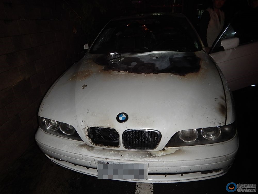 屏東縣潮州鎮朝昇路1巷52號日前發生「火燒車」事件,一輛白色BMW引擎蓋竄出火舌,民眾撞見趕緊報案。屏東縣政府消防局潮州分隊受理後,立即由小隊長邱順安帶隊率領警消5人、替代役男1人、義消2人,出動水箱車、水庫車及救護車前往搶救。