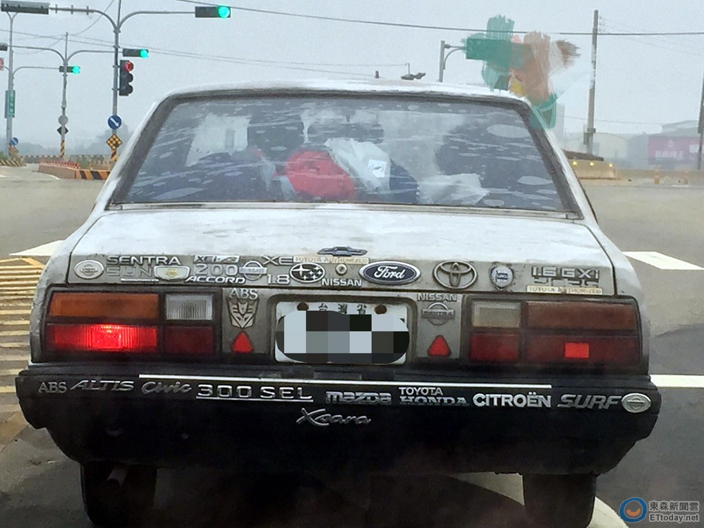 這台車到底是什麼牌子?有網友在臉書「爆廢公社」PO出一張照片,照片中的車子後車箱蓋及保險桿上貼滿了各家汽車廠牌的LOGO,讓網友戲稱這台車真是「集眾廠牌於一身啊!」