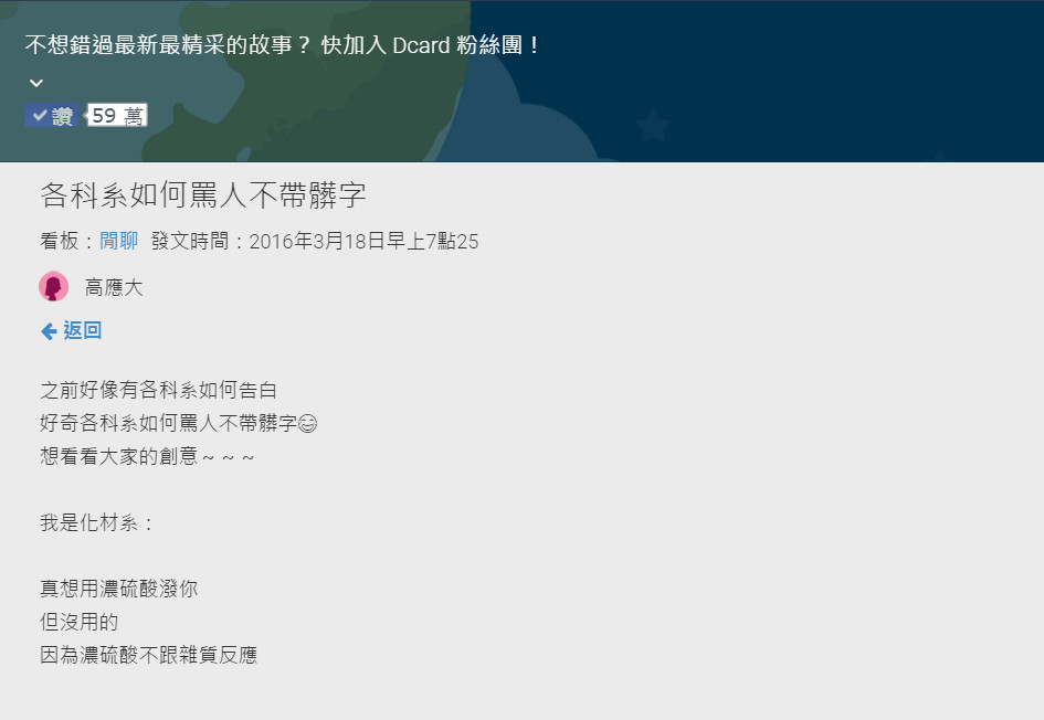 有網友在《Dcard》發起「各科系如何罵人不帶髒字」活動,想看看大家如何發揮創意,原PO先寫下我是化材系:「真想用濃硫酸潑你,但沒用的,因為濃硫酸不跟雜質反應。」底下網友也跟著仿效紛紛留言,截至下午,已有一千多名網友回應。