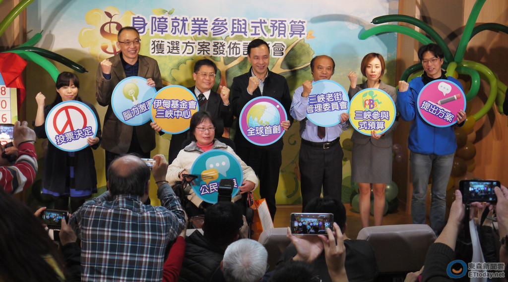 新北市全國首創「身心障礙者就業促進方案參與式預算」,由伊甸社會福利基金會所提「湧流社」,及三峽老街管委會所提「我也可以做自己的老闆」兩案勝出,市長朱立倫表示,參與式預算是民主社會重要一環,讓所有的公民直接參與重要的政策執行,不用拍桌、抗議,似乎和新總統蔡英文「如果政府沒聽見,你可以拍桌子」的說法,互別苗頭。