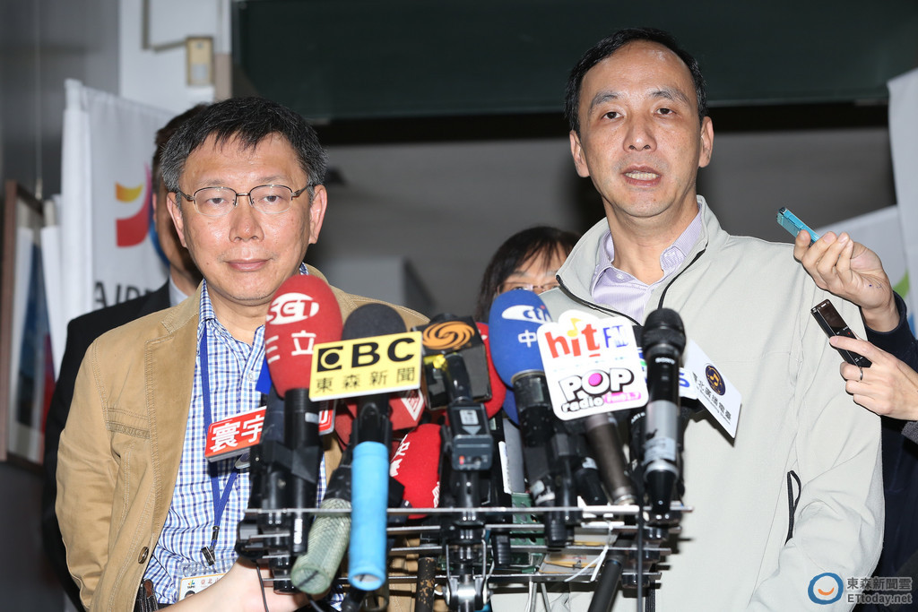 ▲柯文哲、朱立倫在雙北會議後共同接受聯訪。(圖/記者李鍾泉攝,下同)