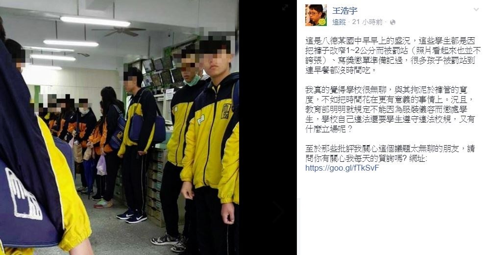 學校對學生的服儀規定應該怎麼做才洽當?綠黨桃園市議員王浩宇相當關心校園教育,常提出改革見解,引起討論。22日他在臉書提到,桃園八德的某國中因為學生將制服褲改窄,而叫學生罰站並準備記過,甚至連早餐也拎在手上沒得吃。他對此批評學校「很無聊」、「不如把時間花在更有意義的事上」,再度引起熱議。