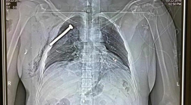 比利時首都布魯塞爾爆發連環恐攻,造成35人死亡、超過百人受傷,歐洲各國再度陷入恐怖攻擊的陰影。當地北部醫院「University Hospital Gasthuisberg」今日公布傷者X光照,從畫面可見一根釘子直直插入胸腔。
