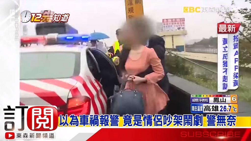 據了解,女子吵架時一度情緒失控,在車內脫掉上衣,還要下車被男友擋下;員警找來女警支援,見趕到現場的記者要了解情況,先阻止記者上前,表示女子在車上穿衣服。情侶互嗆要告對方傷害,後來被請上警車。