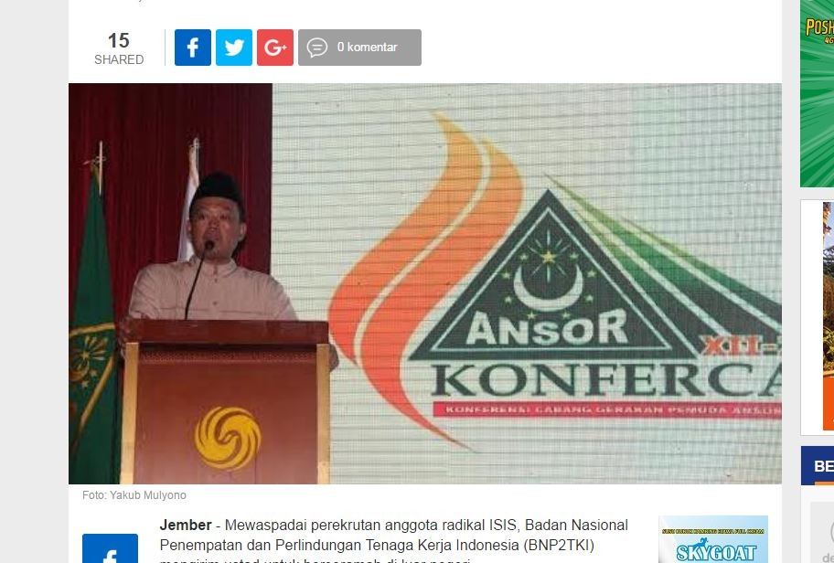 根據印尼媒體《detik》報導,印尼外勞發展署署長瓦希德(Nusron Wahid)3月20日表示,據消息來源指出,部分遭伊斯蘭國洗腦或想法激進的印尼勞工已經滲透至亞洲各國,「先前在南韓就逮到2名參與IS恐怖組織的印尼勞工」他進一步指出,香港先前也有類似案例,許多印尼勞工配戴有關象徵IS的飾品。