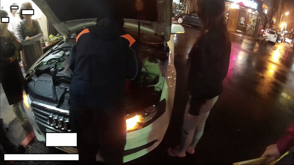 昨天各地皆有短暫陣雨發生,消防員抵達現場時,隱約可由車子的引擎蓋內聽見小貓的叫聲,打開引擎蓋,發現一隻黃白相間的小貓,牠見狀更往引擎後方鑽入。報案的曾姓車主表示,聽見小貓持續微弱的叫聲,循聲發現小貓應該是困在車子引擎蓋內。
