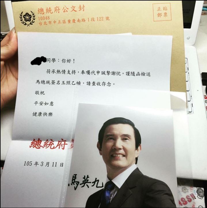 該名網友表示,陸生朋友去參加了一場總統馬英九與副總統吳敦義的會議,之後就收到一封信寫著「荷承熱情支持.......謹隨函檢送馬總統簽名玉照乙幀,請查收存念。」有網友看了直說「照片修很大!」更有人開玩笑要該名網友收好,以後可以拿來「玩交換禮物!」也有網友建議「貼在門口,小偷看到就腿軟。」