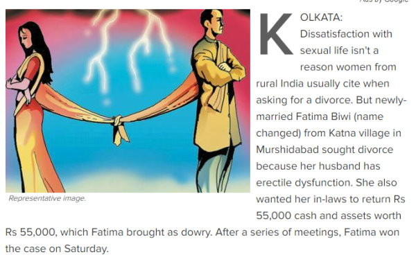 少女提到,離婚不是件新鮮事,但過去村內從未因為「性無能」的理由提出離婚,儘管有村民嘲笑她,但少女說「如果要和陽痿的丈夫痛苦地過一輩子,我寧可先說出來痛苦一時。」