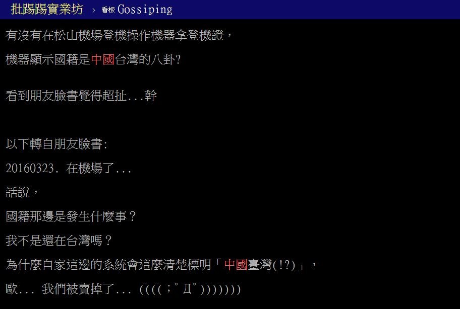 網友YangJimmy24日在PTT上轉貼朋友臉書發文,內容提到,23日出發松山機場列印登機證時,列印出來的資料上居然標明國籍是「中國臺灣」,「國籍那邊是發生什麼事?我不是還在台灣嗎?我們被賣掉了...」,這也讓網友直呼:「難道說中國台灣是正式名稱了?」,希望政府能夠正視這項問題。