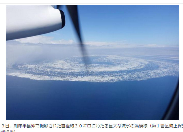 日本北海道周邊海域日前出現了直徑長達30公里的巨大流冰漩渦,白色的圓圈重疊散布在深藍海面上相當壯觀,而日本海上保安總部也派出飛機進行調查,觀測地點位於知床半島以北約30公里的鄂霍次克海。