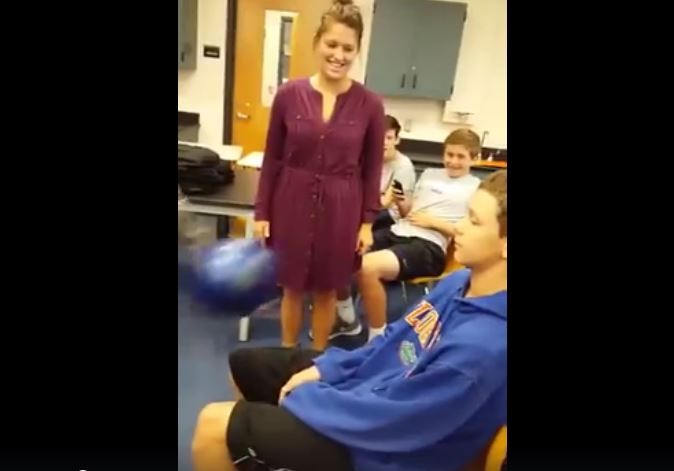 臉書粉專「加藤軍台灣粉絲團 2.0」分享國外一段影片,地點是在學校教室內,一名女老師手持鍊子拴住的保齡球,要向大家證明鐘擺實驗。畫面中,男學生穩坐在椅子上,保齡球左右搖擺,卻沒有擊中他的臉,同學們嘖嘖稱奇。不過,當男學生輕鬆離席時,竟沒注意到迎面而來的保齡球,慘遭重擊下體。