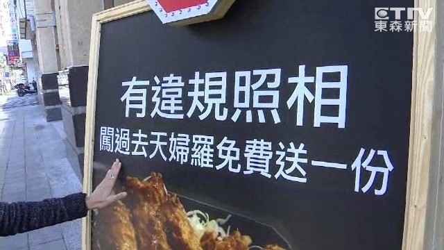 ▲奇招牌「有違規照相,闖過去,天婦羅免費送一份」。(圖/東森新聞,下同)
