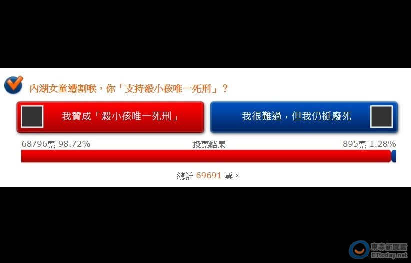 北市內湖區28日上午11時許,驚傳4歲劉姓女童斷頸案,引起社會譁然,對於「殺童執行唯一死刑」的聲浪在度浮出檯面。《ETtoday東森新聞雲》也以此為題,進行網路投票,截至29日凌晨0時,共有69691名網友參與。其中有68796名網友贊成「殺小孩唯一死刑」,占98.72%;895名網友表示「我很難過,但我仍挺廢死」,占1.28%。