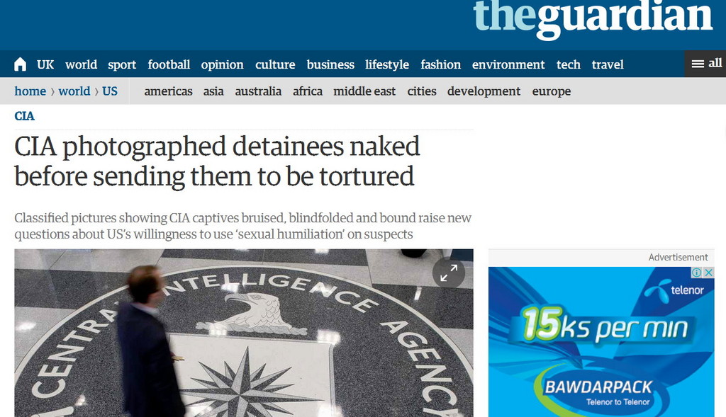 英國《衛報》28日(周一)卻公開一批資料和照片,揭露美國中央情報局(CIA)人員利用不人道方法對待涉嫌的恐怖分子:包括把被捕者的眼睛蒙起來後拳打腳踢,再強迫拍攝他們的裸照,然後才把他們押解給外國執法部門繼續嚴刑拷問。這些材料進一步揭露美國執法部門使用性羞辱手段,對被捕者百般折磨。