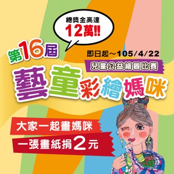 繪畫最能發揮孩子的想像力和創意,也是親子間最好的互動方式,為了讓親子度過不一樣的兒童節及母親節,聯邦銀行第16屆「藝童彩繪媽咪」兒童公益繪圖比賽自即日起開始徵件,所有國小以下的小朋友只要以8開圖畫紙畫出與媽咪最幸福的時光,連同報名表於4月22日前交件即獲參賽資格,總獎金超過12萬元,另將依參賽作品收件量,捐款補助偏鄉學童營養午餐經費。