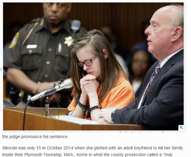 美國密西根州現年17歲的少女史考斯基(Roksana Sikorski)2年前與男友合謀殺害全家,趁半夜家人都在睡夢中時,持刀砍傷當時12歲的弟弟,被現場目擊的妹妹尖叫聲嚇到慌忙逃走,最後仍被捕,周一(20日)被判刑20年,教唆她殺人的24歲男友里維拉(Michael Rivera)已經在日前被判無期徒刑。