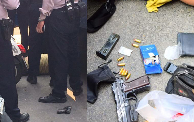 有網友在《爆料公社》上傳兩張照片,從圖中可以看到警察將嫌犯壓制在地,旁邊還圍著三名員警,據悉這名持有手槍的嫌犯,原先是因為貨車違規停駛,引起警方注意,上前盤查後發現他持有毒品,正要將他逮捕時,這名身穿黃色衣服的男子,拿出上膛的手槍,作勢要開槍,但立刻被警發方阻止,手槍還直接噴到地板。
